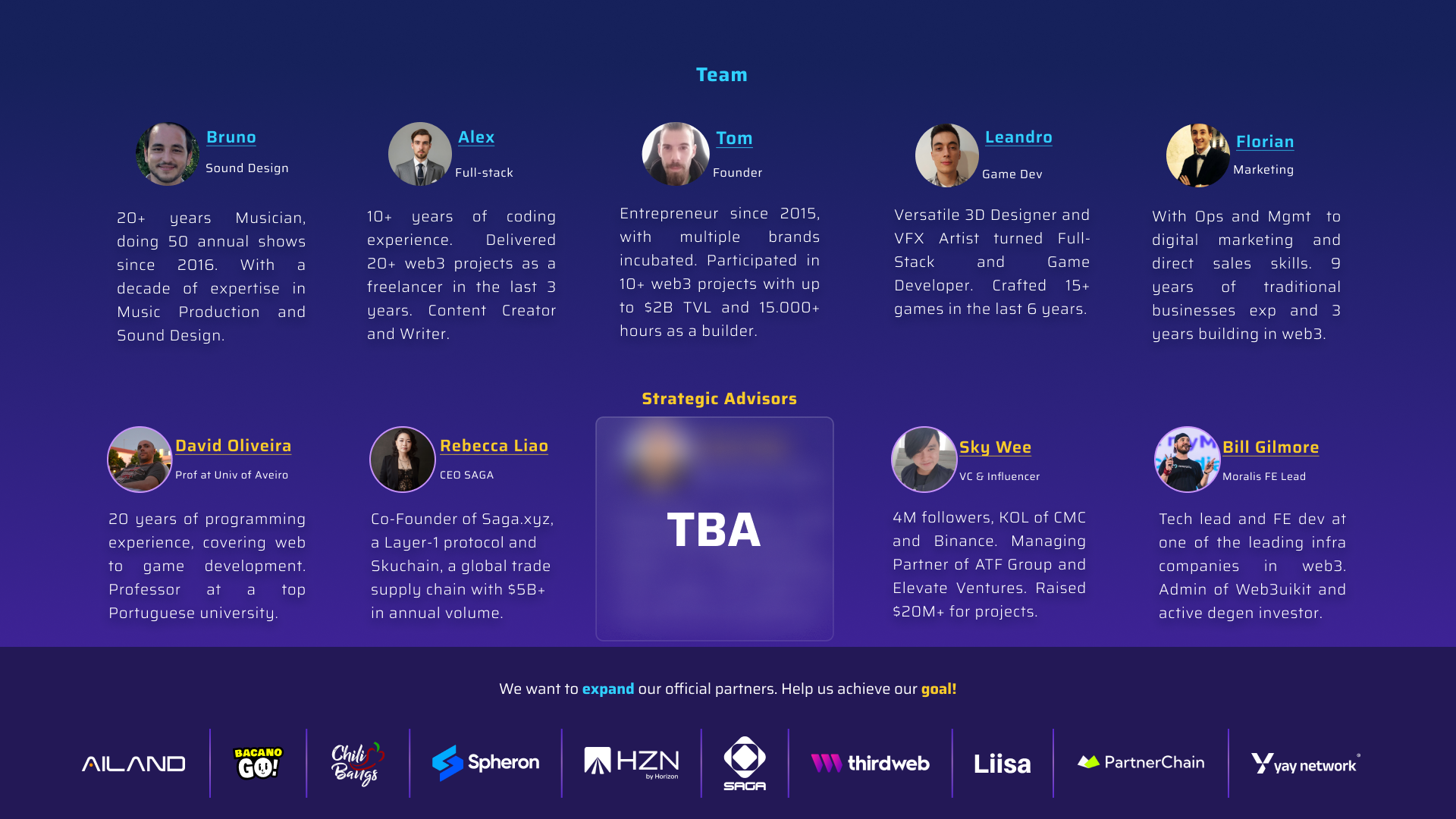 <figure><img src="https://3386444709-files.gitbook.io/~/files/v0/b/gitbook-x-prod.appspot.com/o/spaces%2FmTTM9iq9CNBXk1rilzgM%2Fuploads%2Fm9pi4PHP7WZpHVOcZDcL%2F6%20-%20Team.png?alt=media&#x26;token=f1b1644d-8eea-4fd8-aef7-4c73351a84a1" alt=""><figcaption><p>Team and Partners</p></figcaption></figure>